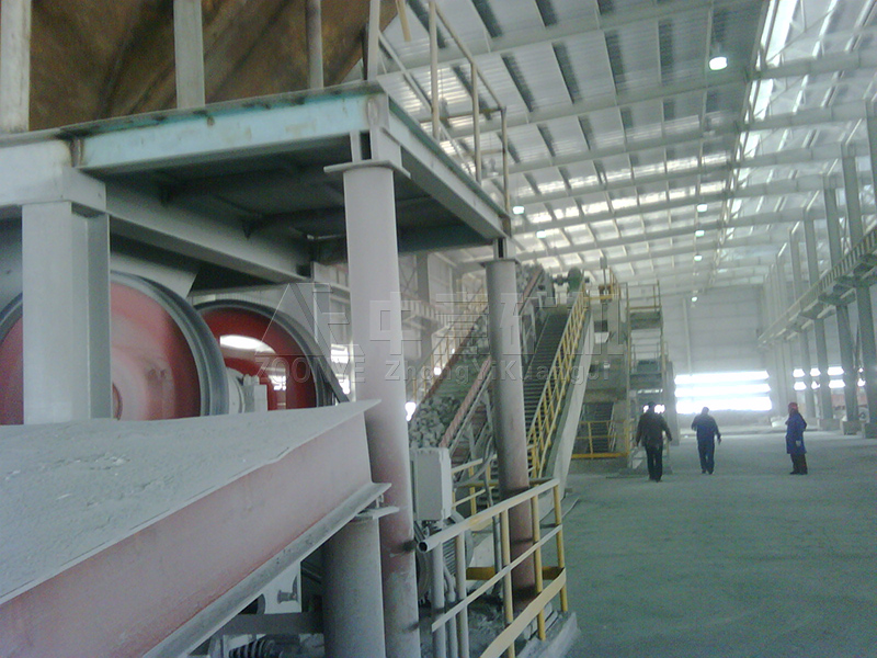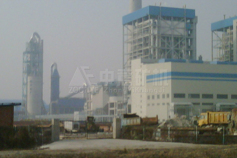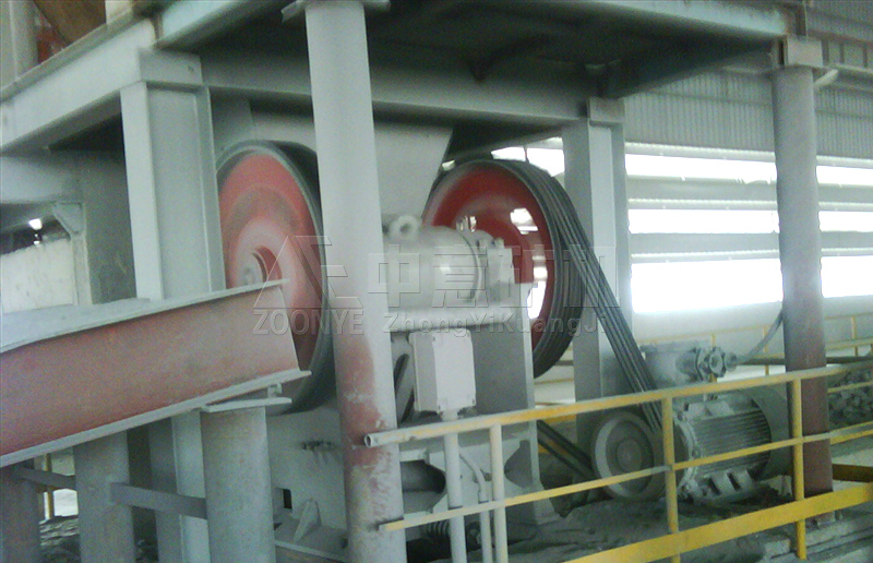 料仓中的石灰石和焦碳或无烟煤由电机振动给料机送至称量斗,配比的混合料由胶带运输机送至石灰窑上料斗,卷扬机带动料斗至石灰窑顶,物料进入石灰窑,在窑内煅烧。粒度为45~140mm石灰从窑底经胶带运输机运出,经颚式破碎机破碎后粒度为≤50mm,然后用斗提机送至配料站。窑顶尾气经布袋除尘后接烟囱排空。