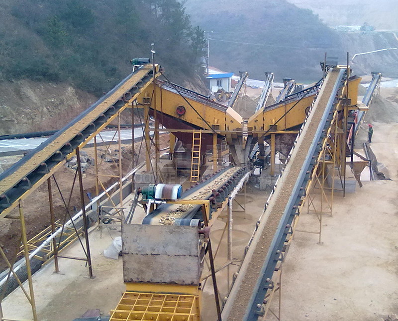 该套生产线主要由给料机、鄂式破碎机、反击式破碎机、振动筛、皮带输送机等组成,是生产建筑、公路、铁路用砂和石料的专用石料设备,成功应用于石灰石、玄武石、花岗岩、鹅卵石等岩石的破碎加工,破碎后的成品质量达到GB14685-2001标准,为高等公路、铁路、水利、混凝土搅拌站等行业提供了合格骨料。石料生产线(碎石生产线)自动化程度高,成套生产线除了对设备的开机停机及日常维护之外,几乎不需要人工操作。其生产效率高,运行成本低,产量大,收益高,成品石子粒度均匀、粒形好,符合国家高速用料要求。