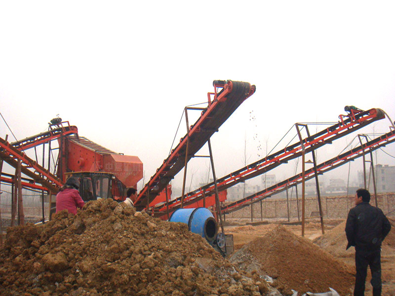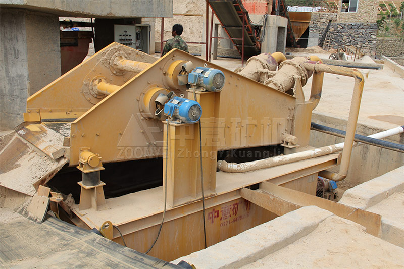 原料经由原料仓,在振动给料机作用下均匀送入到反击破初步破碎,之后在皮带输送机运送均匀进入圆锥内中细碎+整形加工,生产出的砂石骨料进入轮斗洗砂机,细沙回收机内进行处理。